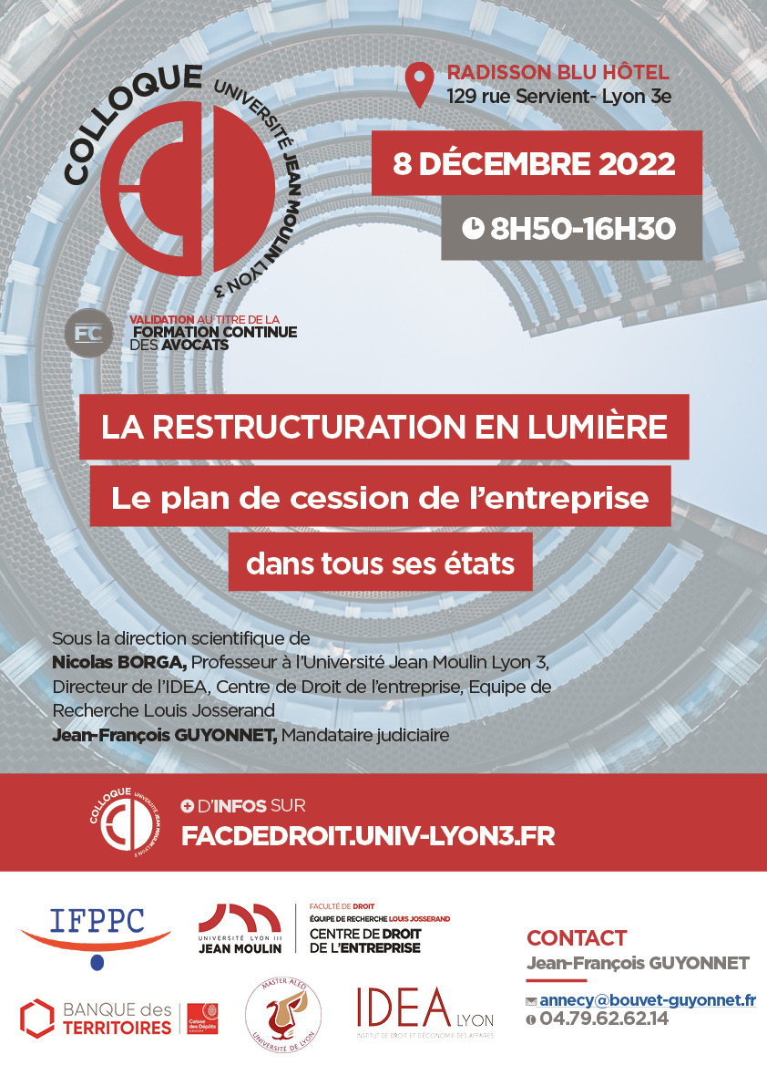 Sous la direction scientifique de Nicolas BORGA, Professeur à l’Université Jean Moulin Lyon 3, Directeur de l’IDEA, Centre de Droit de l’entreprise, Equipe de Recherche Louis Josserand et Jean-François GUYONNET, Mandataire judiciaire, Président de la 7e Compagnie de l'IFPPC