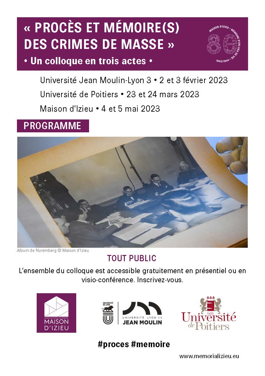 Les trois colloques coordonnés organisés en 2023 sont l’aboutissement de ce travail. Seront étudiées, à Lyon, l’utilité des procès et, à Poitiers, leurs limites pour la mémoire des crimes de masse. A Izieu, ces questionnements seront repris et prolongés au-delà des procès (la justice transitionnelle) et au-delà de la mémoire des crimes (le procès lui-même comme objet de mémoire).
