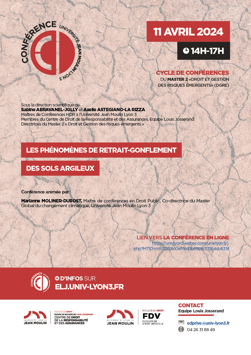 Marianne MOLINER-DUBOST, Maître de conférences en Droit Public, Co-directrice du Master Droit Global du changement climatique à l'Université Jean Moulin Lyon 3, interviendra le jeudi 11 avril 2024 de 14h à 17h sur le thème : « Les phénomènes de retrait-gonflement des sols argileux ».