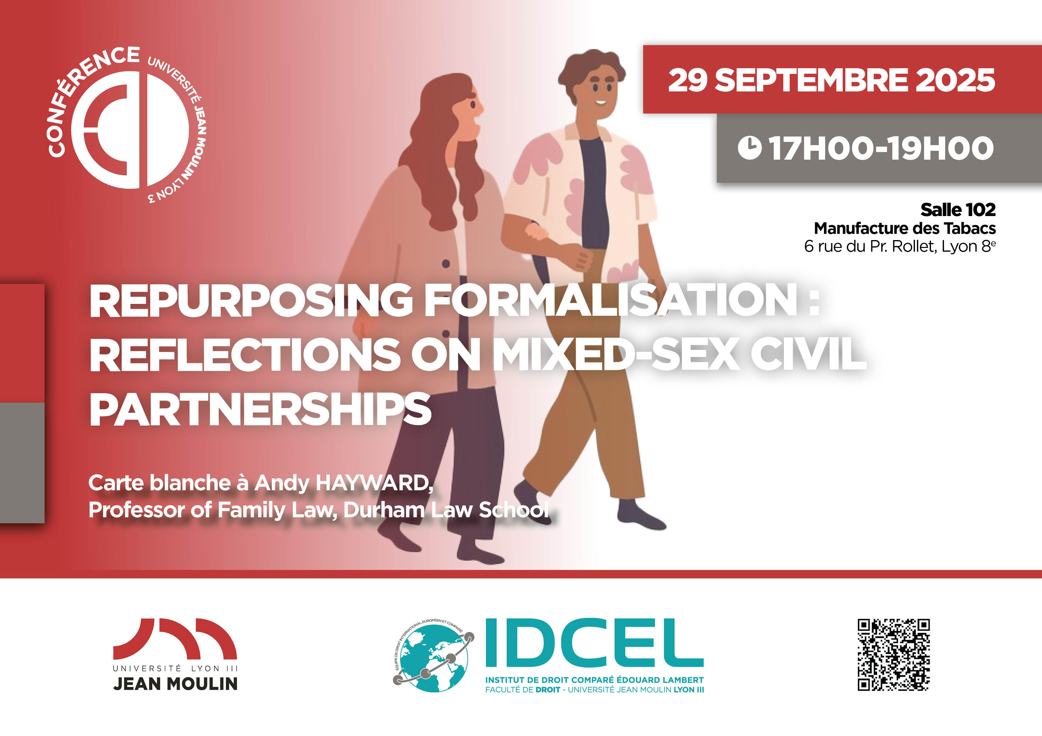 Dans le cadre de son séjour en tant que Professeur invité dans le D.U. de droit anglais, Andy HAYWARD (Professeur de droit de la famille à la Durham Law School) a carte blanche pour présenter une conférence intitulée "Repurposing Formalisation : Reflections on Mixed-Sex Civil Partnerships".