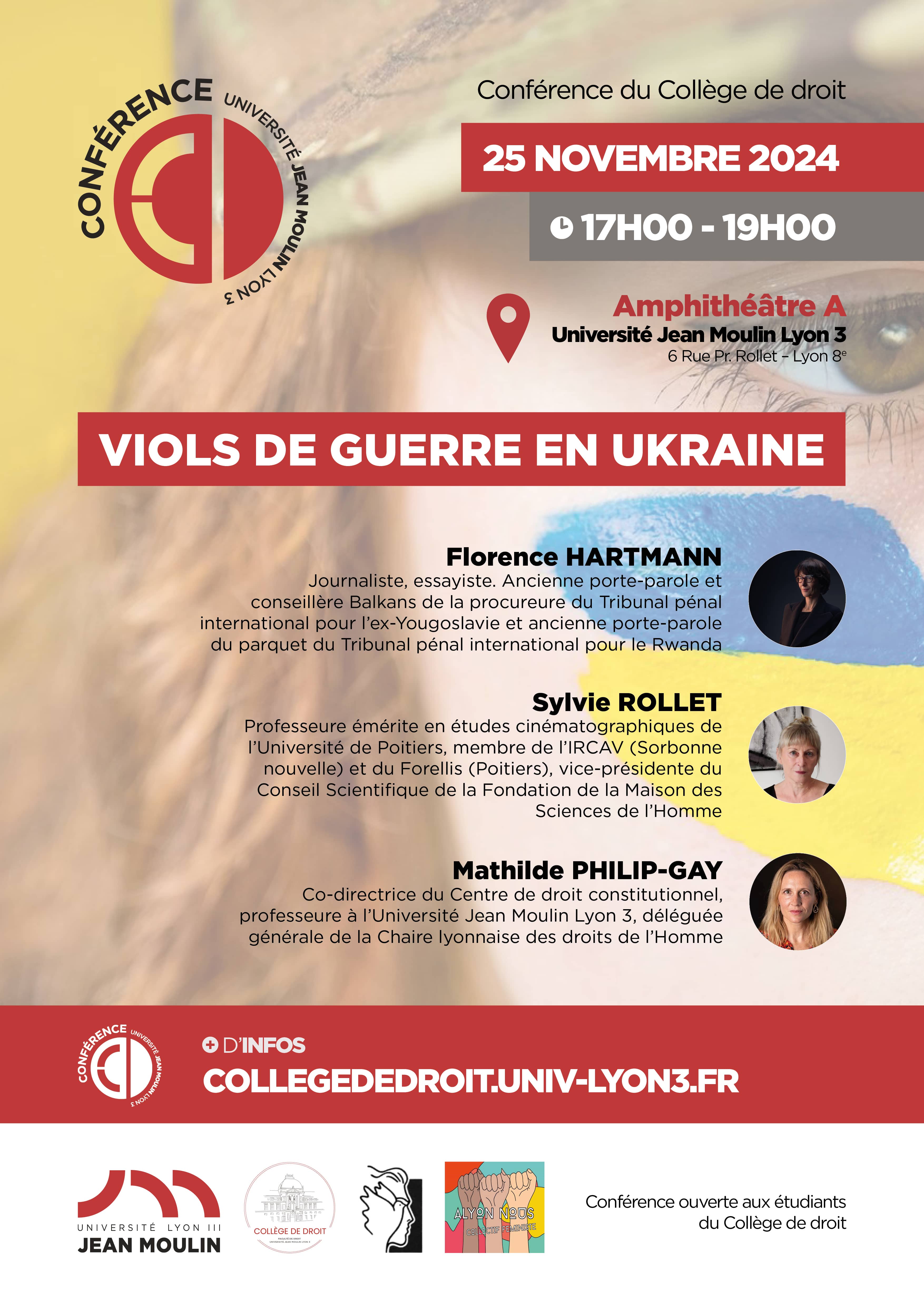 S’intéresser à ces aspects de la guerre souvent qualifiés de simples dommages collatéraux, c’est soulever des non-dits, évoquer cette part de l’humanité que nous préférons tous oublier. Car lorsqu’elle se rappelle à nous, qu’il nous est permis d’agir, peut-on encore rester inactif ? Parmi ceux qui répondront par la négative- et nous les espérons nombreux-, les femmes qui sont à l’origine de cette conférence tiennent évidemment une place de choix : Madame Hartmann, aux multiples casquettes de journaliste, essayiste et porte-parole lors du jugement des crimes de guerre au Rwanda ou en ex-Yougoslavie ; Madame Rollet, professeur en études cinématographiques qui par le septième art met en exergue les effets mémoriels des traumatismes historiques ; Madame Philip-Gay, professeure à l’Université Jean Moulin Lyon 3 et membre active de SEMA, association qui regroupe les survivantes des violences sexuelles en Ukraine.