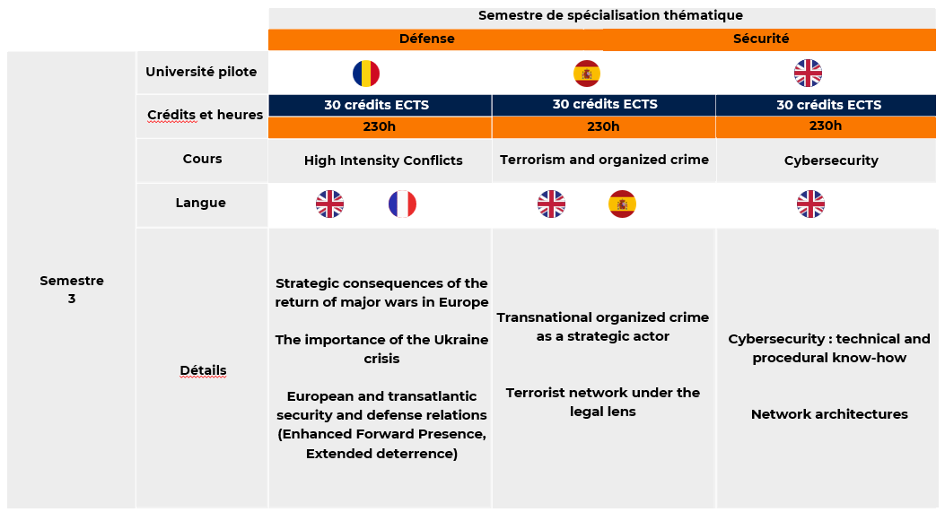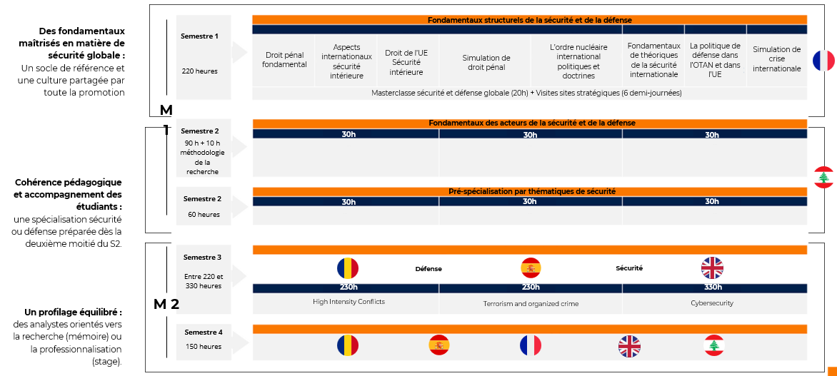 La formation met en valeur les positionnements respectifs des partenaires pour proposer des approches différentiées de la sécurité et de la défense. La professionnalisation est construite autour d’un management interculturel des systèmes et des entreprises de sécurité.