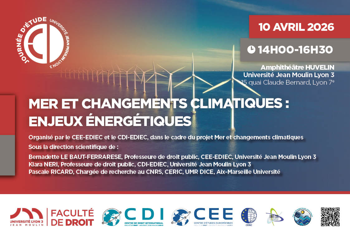 Journée d'étude organisée dans le cadre du projet Mer et changements climatiques, par le CEE-EDIEC et le CDI-EDIEC, sous la direction scientifique de Bernadette Le Baut-Ferrarese (Professeure de droit public, CEE-EDIEC, Université Jean Moulin Lyon 3), Kiara NERI (Professeure de droit public, CDI-EDIEC, Université Jean Moulin Lyon 3) et Pascale RICARD, Chargée de recherche au CNRS, CERIC, UMR DICE, Aix-Marseille Université)