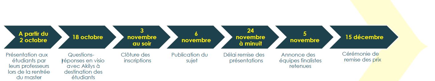 Les candidats peuvent se présenter soit par équipes déjà constituées entre étudiants de différents Masters, soit individuellement et les équipes seront alors constituées aléatoirement par Akilys.