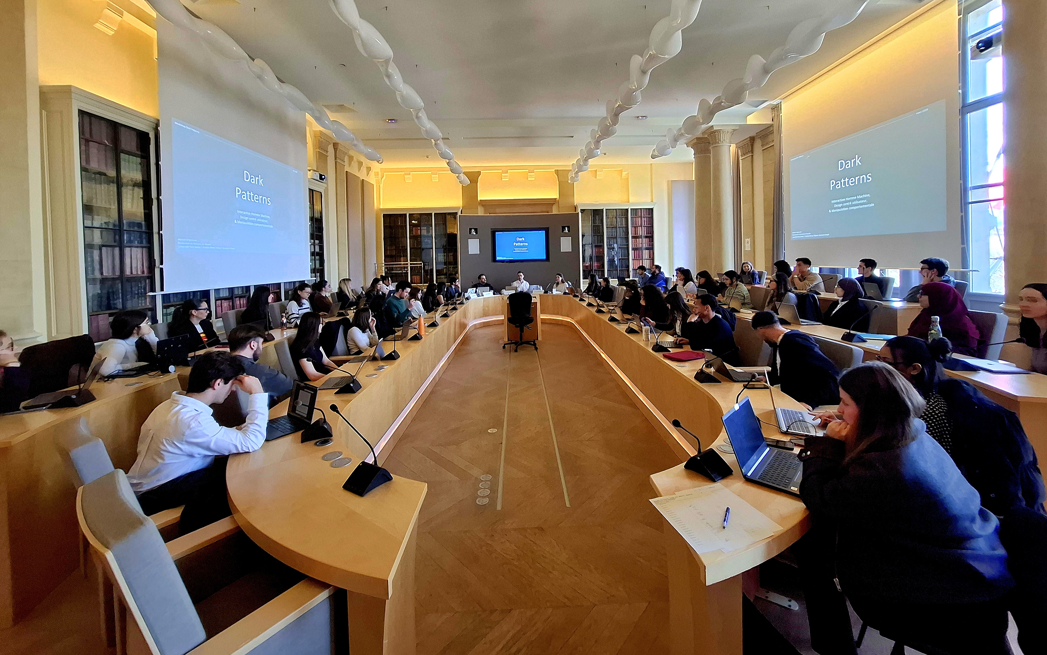 Pendant une heure, Marion Seigneurin (doctorante à l’Université Paris-Saclay), Ludovic Pailler (Professeur de droit privé à la Faculté de droit de l’Université Jean Moulin Lyon 3 – CREDIP-EDIEC) et Samir Merabet (Professeur de droit privé à la Faculté de droit de l’Université Jean Moulin Lyon – ELJ) ont présenté au public des éléments de définition, le cadre juridique, ainsi que quelques affaires en cours. Ensuite, ce fut aux participants de jouer ! Répartis en groupe de travail, ils ont été chargés de partir à la recherche de dark patterns sur différentes plateformes en ligne (réseaux sociaux, places de marché, etc.), et de préparer une plainte à destination de l’autorité compétente.