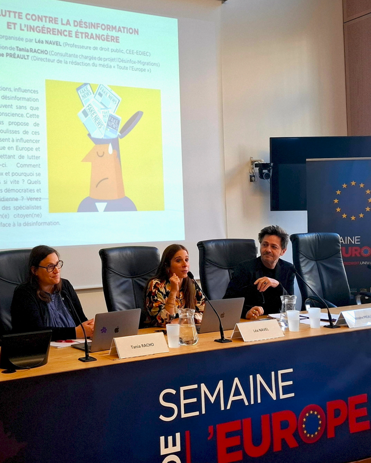 Invités par Léa Navel, Tania Racho (consultante chargée de projet chez Désinfox-Migrations) et Christophe Préault (directeur de la rédaction du média « Toute l’Europe ») ont apporté leur éclairage et leur expertise sur les stratégies visant à influencer l'opinion publique et les démocraties en Europe par la diffusion de fausses informations, et les outils permettant de lutter contre celles-ci. Les échanges, riches, ont permis de mieux comprendre les risques pesant sur nos démocraties et la vie quotidienne des citoyens, venus en nombre pour être mieux armés contre la désinformation.